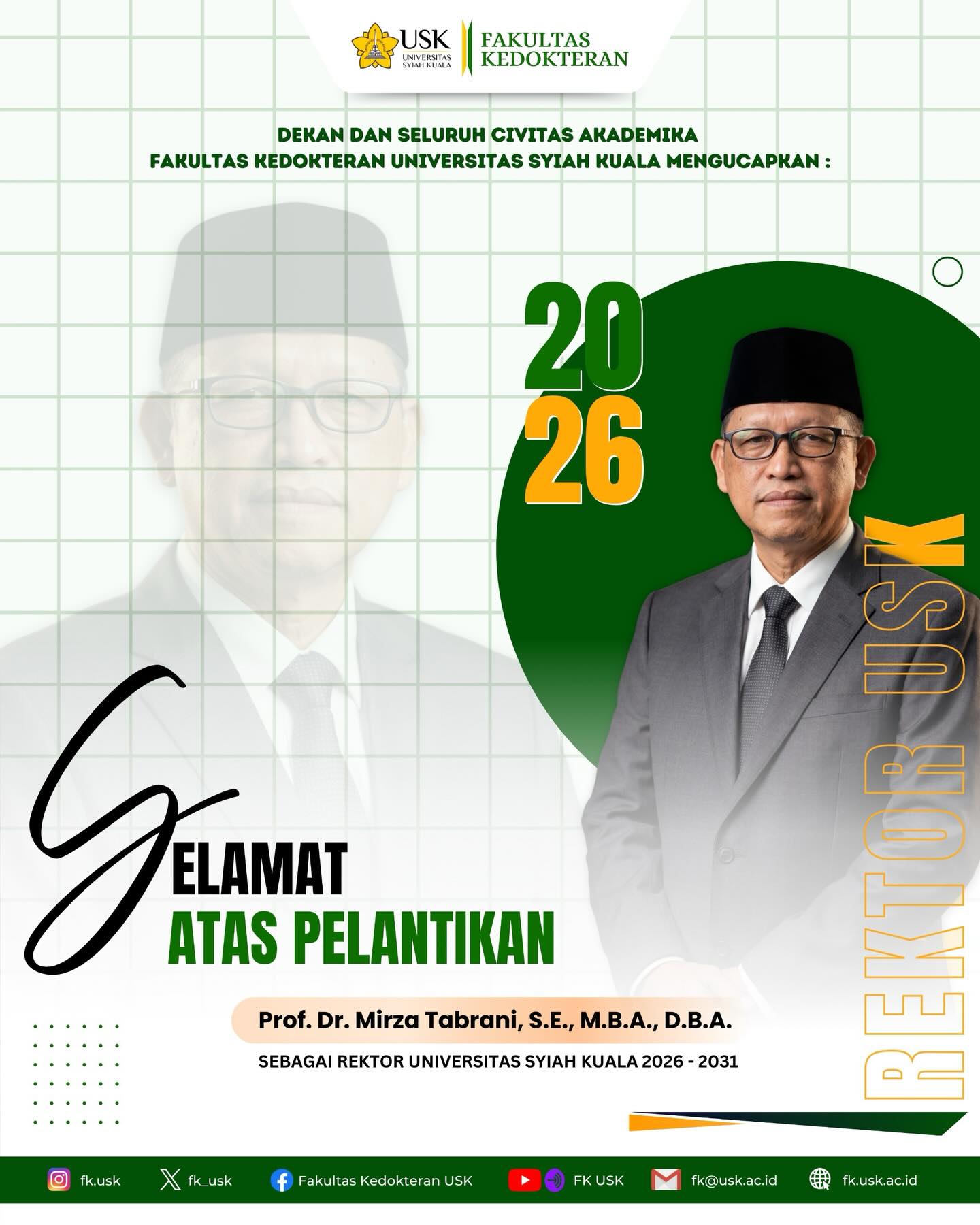 Selamat dan Sukses atas Pelantikan Rektor Universitas Syiah Kuala Periode 2026–2031 Dekan dan seluruh civitas akademika Fakultas Kedokteran Universitas Syiah Kuala mengucapkan selamat dan sukses kepada Prof. Dr. Mirza...
