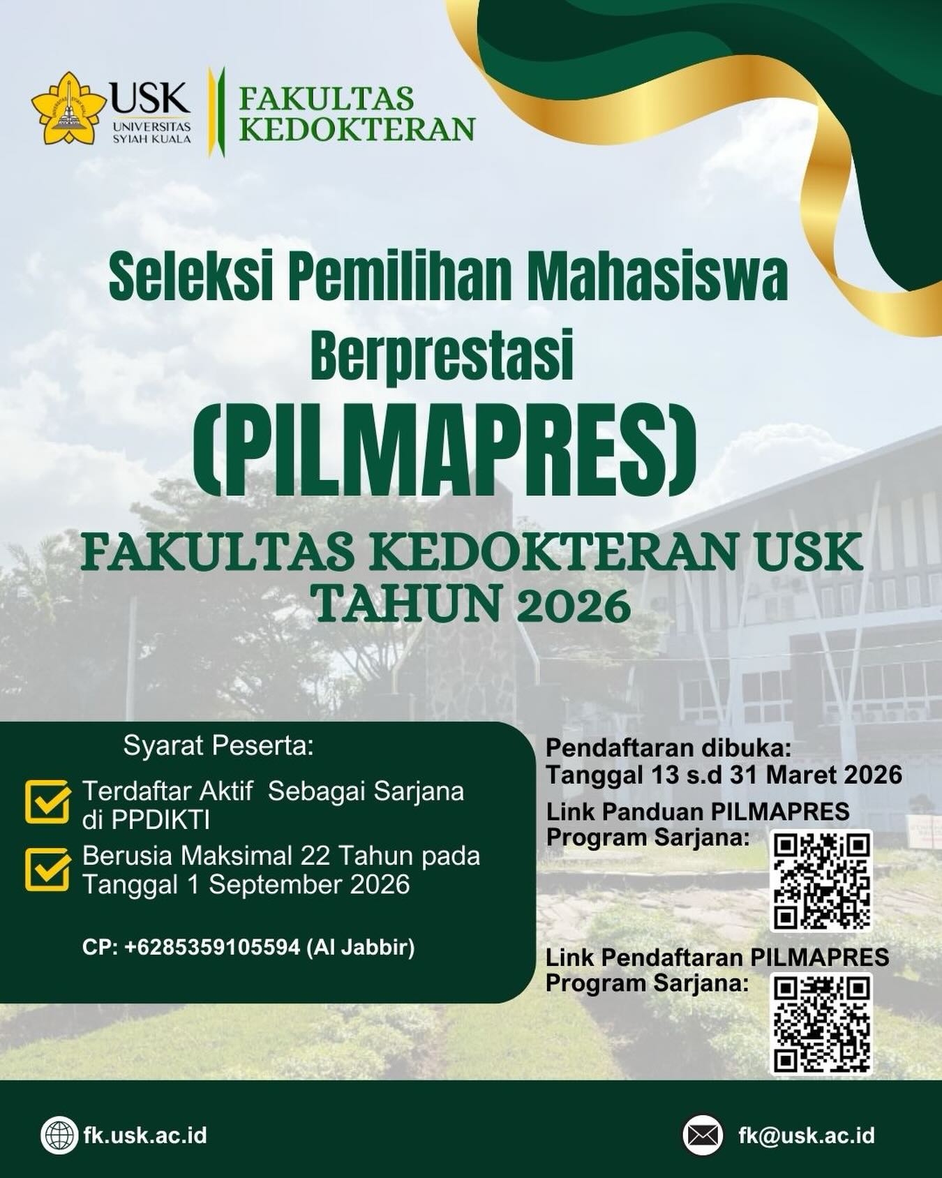 📢 Ayo Daftar PILMAPRES Fakultas Kedokteran USK Tahun 2026! Kesempatan bagi mahasiswa terbaik Fakultas Kedokteran Universitas Syiah Kuala untuk mengikuti Seleksi Pemilihan Mahasiswa Berprestasi (PILMAPRES) tingkat fakultas. Program ini...