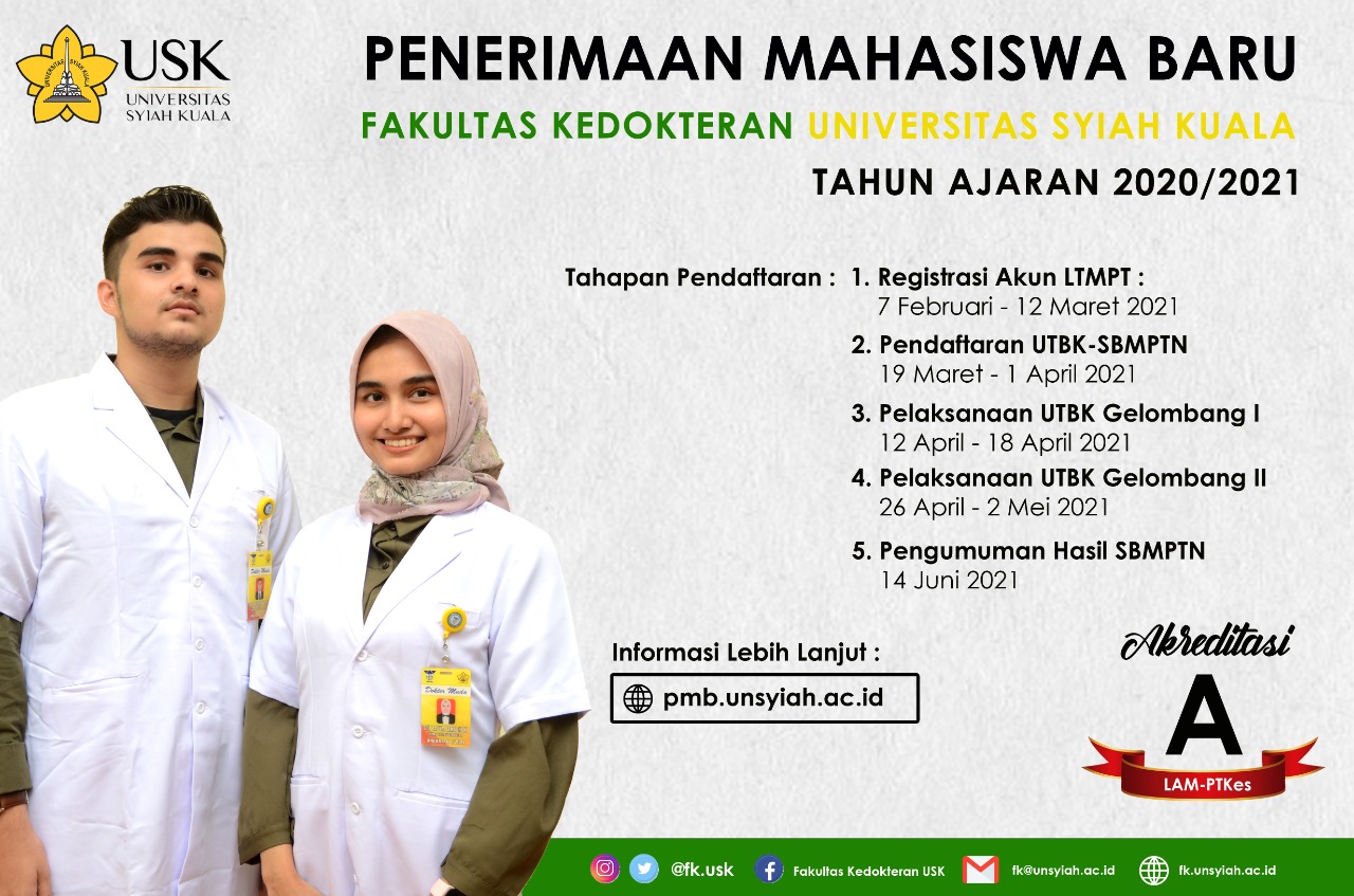 Fakultas Kedokteran Universitas Syiah Kuala sudah membuka Penerimaan Mahasiswa Baru untuk tahun ajaran 2020/2021. Berikut Tahapan Pendaftaran:Registrasi Akun LTMPT (7 Febuari s/d 12 Maret 2021) Pendaftaran UTBK-SBMPTN (19 Maret...