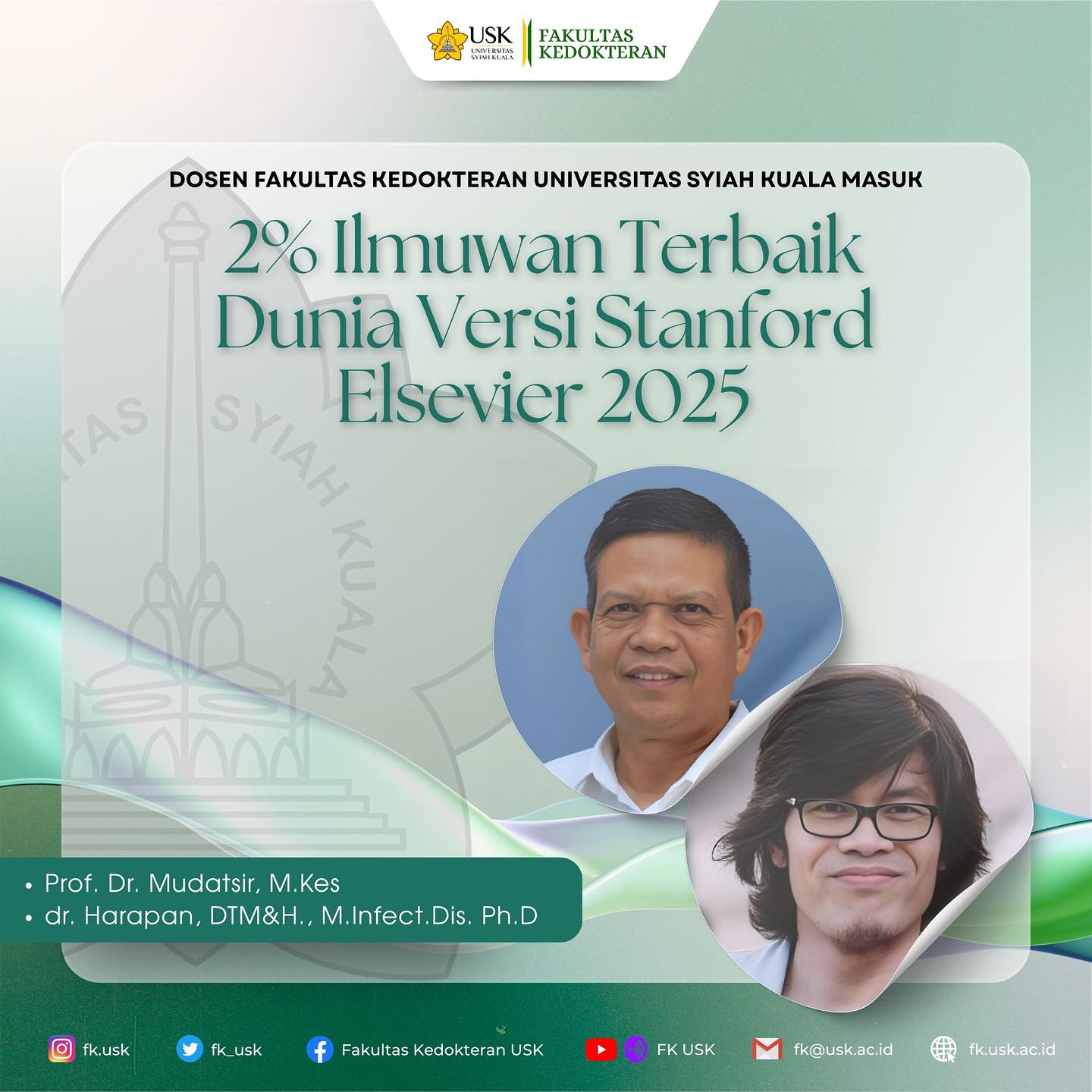 Prestasi membanggakan!Dua dosen Fakultas Kedokteran Universitas Syiah Kuala berhasil masuk dalam daftar 2% Ilmuwan Terbaik Dunia versi Stanford-Elsevier 2025. Selamat kepada:Prof. Dr. Mudatsir, M.Kesdr. Harapan, DTM&H., M.Infect.Dis., Ph.D Dedikasi...