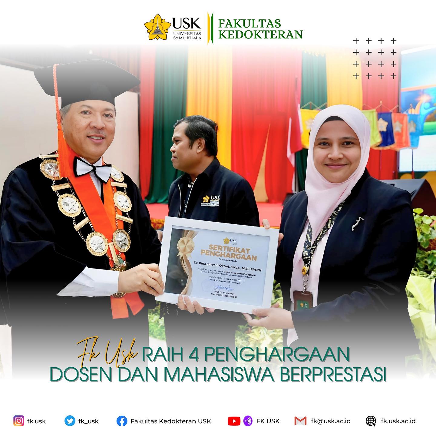 Pada Milad USK ke-64, Fakultas Kedokteran Universitas Syiah Kuala meraih 4 penghargaan pada ajang USK Awards:• Dosen Berprestasi Peringkat II: Dr. Rina Suryani Oktari, S.Kep., M.Si., FRSPH• Dosen Berprestasi...